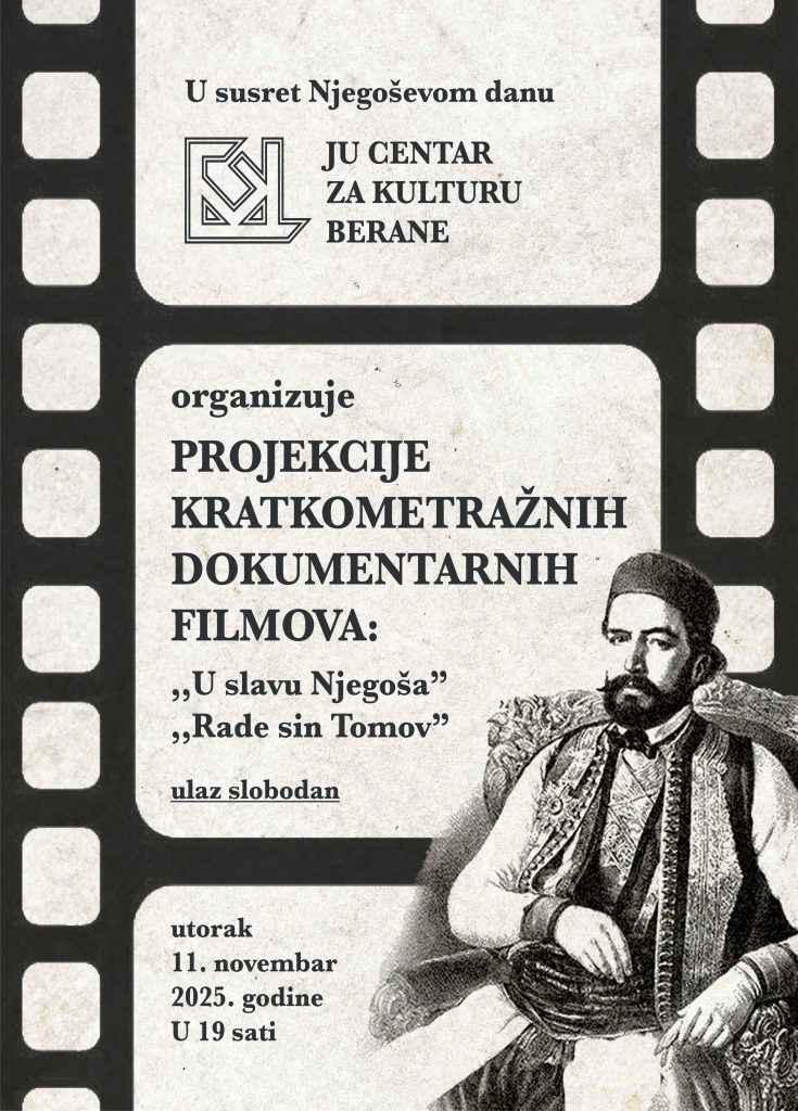 ЈУ Центар за културу Беране обиљежава 13. новембар – Његошев дан, црногорски празник културе. У сарадњи са Црногорском кинотеком, у биоскопу Центра за културу у уторак, 11. новембра 2025. године у 19 часова, биће приказана два документарна филма посвећена лику и дјелу Петра II Петровића Његоша.