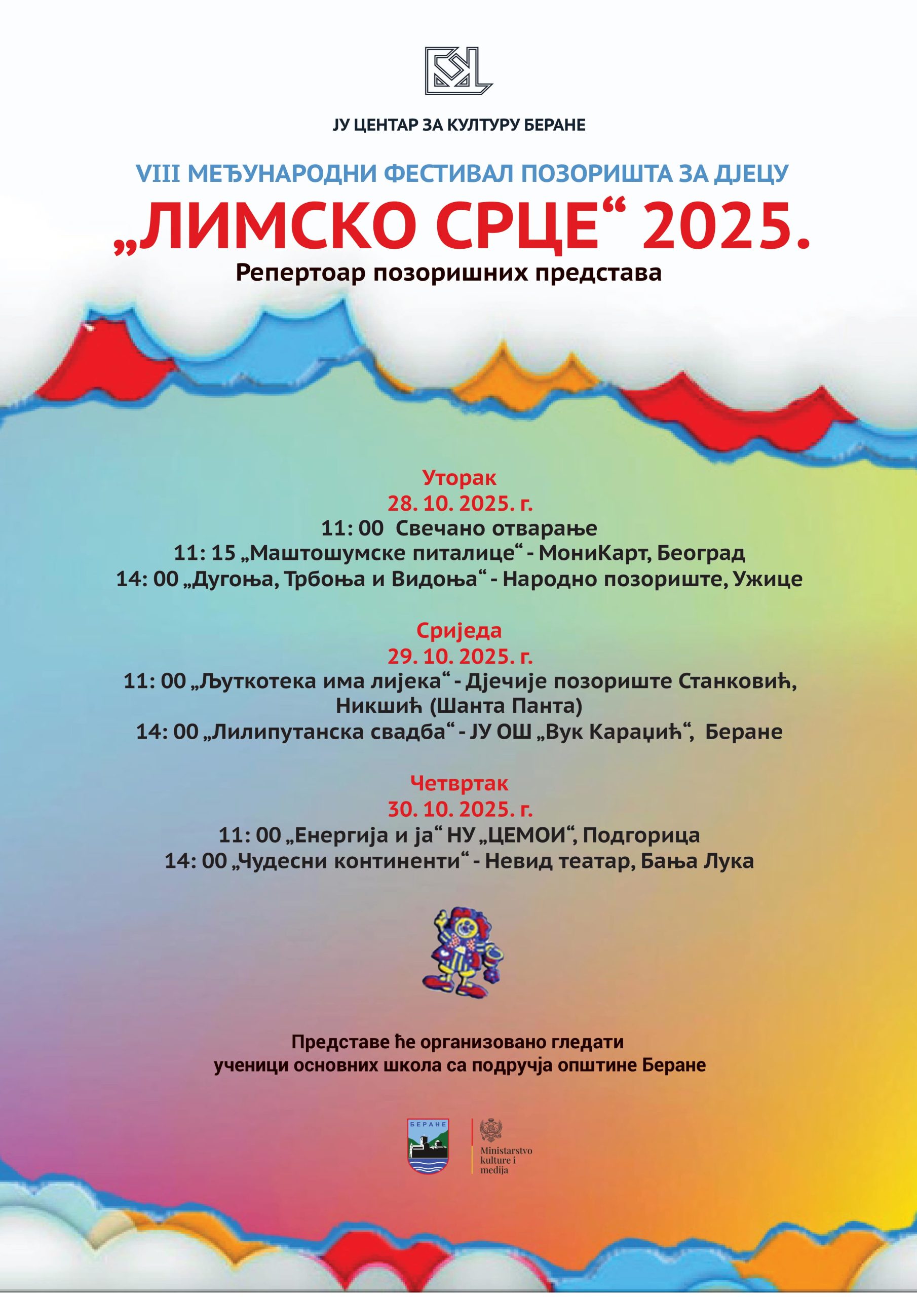VIII Међународни фестивал позоришта за дјецу „Лимско срце“ у организацији ЈУ Центар за културу Беране, а под покровитељством Општине Беране и Министарства културе и медија, биће одржан у периоду од 28. до 30. oктобра 2025. године . Током фестивала на сцени Центра за културу у Беранама, биће изведено шест едукативних и забавних позоришних представа за дјецу, реномираних позоришних кућа из Црне Горе, Србије и Босне и Херцеговине.
