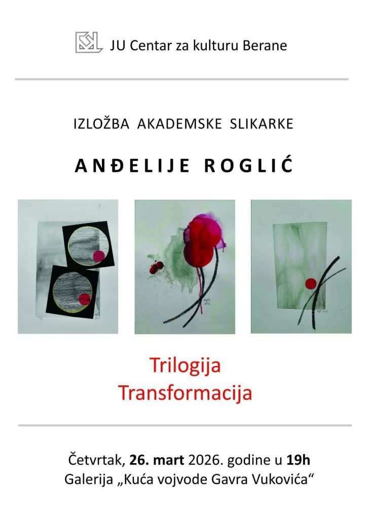 Изложба слика академске сликарке Анђелије Роглић, под називом „Трилогија трансформације“, биће отворена у четвртак, 26. марта 2026. године у 19 часова у галерији Спомен куће војводе Гавра Вуковића.
