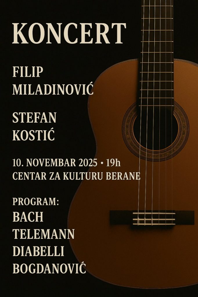 Млади гитаристи Филип Миладиновић и Стефан Костић одржаће концерт класичне музике у сали Центра за културу у понедјељак, 10. новембра 2025. године са почетком у 19 часова.
