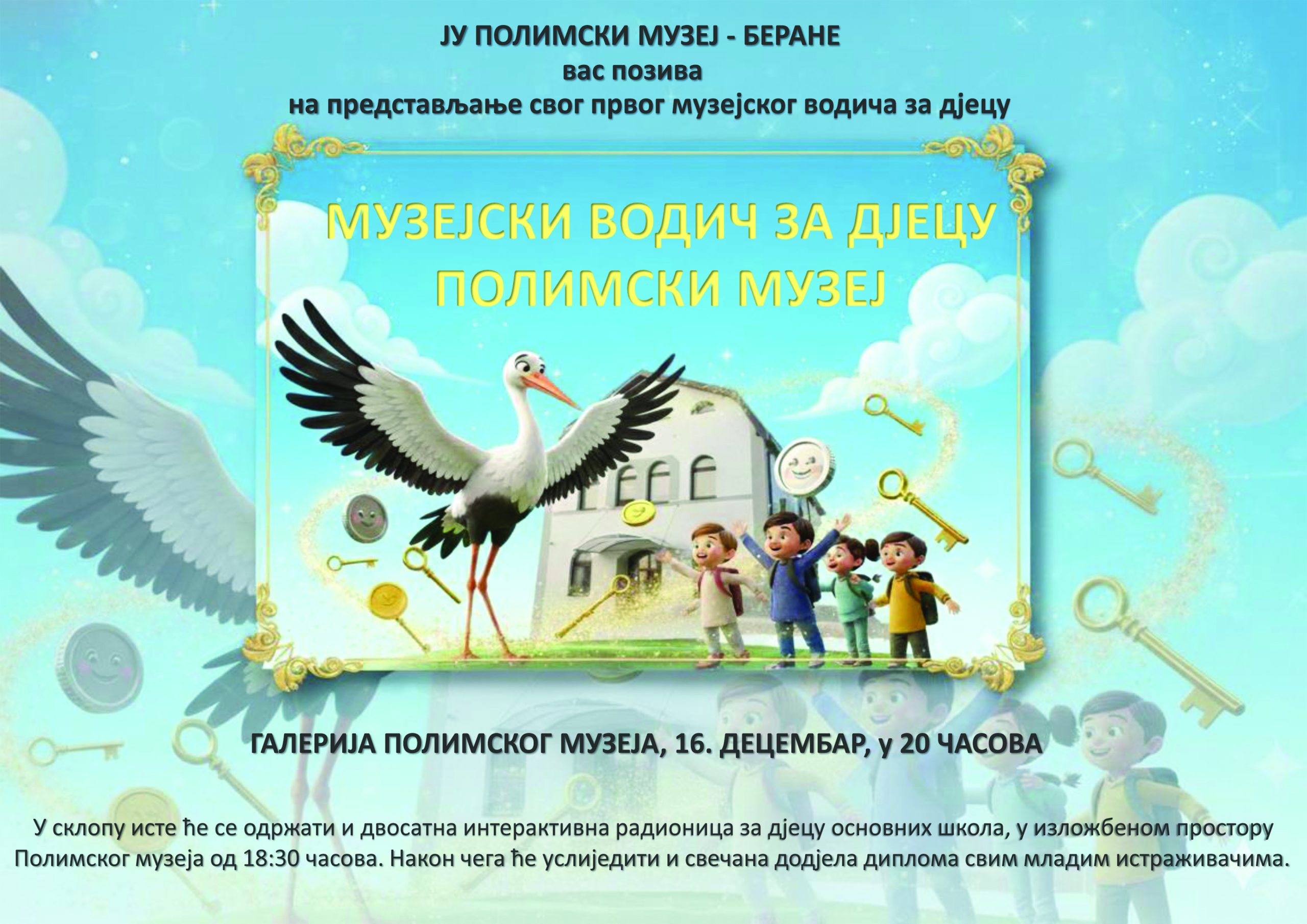 У уторак, 16. децембра, у 20 часова, у галерији Полимског музеја, одржаће се промоција Музејског водича за дјецу Полимског музеја. То је прва публикација ове врсте, направљена са циљем да најмлађим посјетиоцима на занимљив начин приближи богато наслеђе и музејске предмете које чува Полимски музеј. Вјерујемо да ће овај водич инспирисати нове генерације љубитеља историје и умјетности.