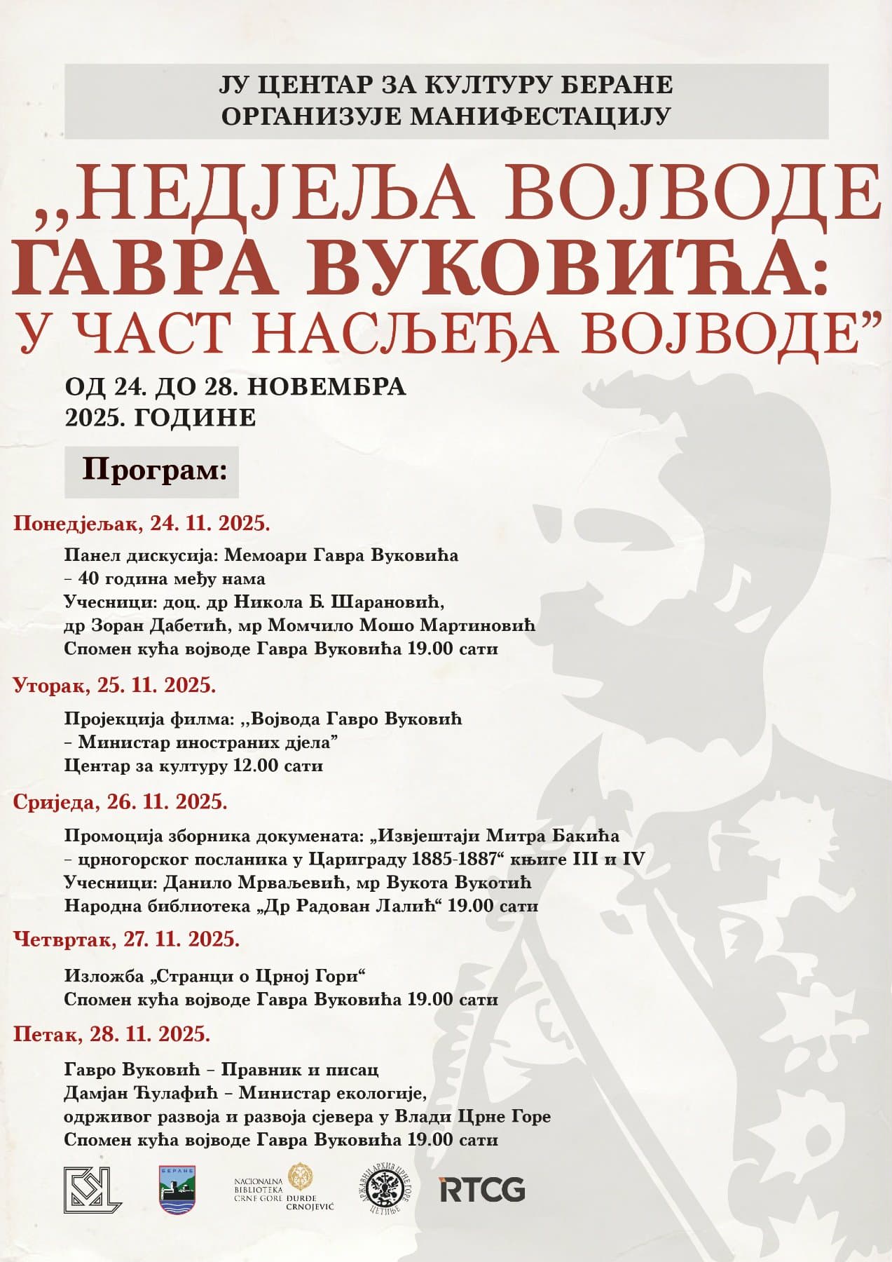 У уторак, 25. новембра у 12 часова, у биоскопу Центра за културу биће приказан филм „Војвода Гавро Вуковић – Министар иностраних дјела“, у продукцији Радио – телевизије Црне Горе. Пројекцију ће организовано гледати ученици средњих школа из Берана.