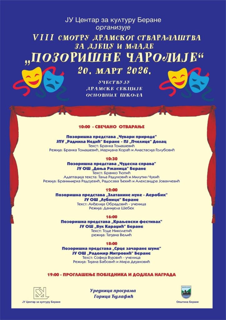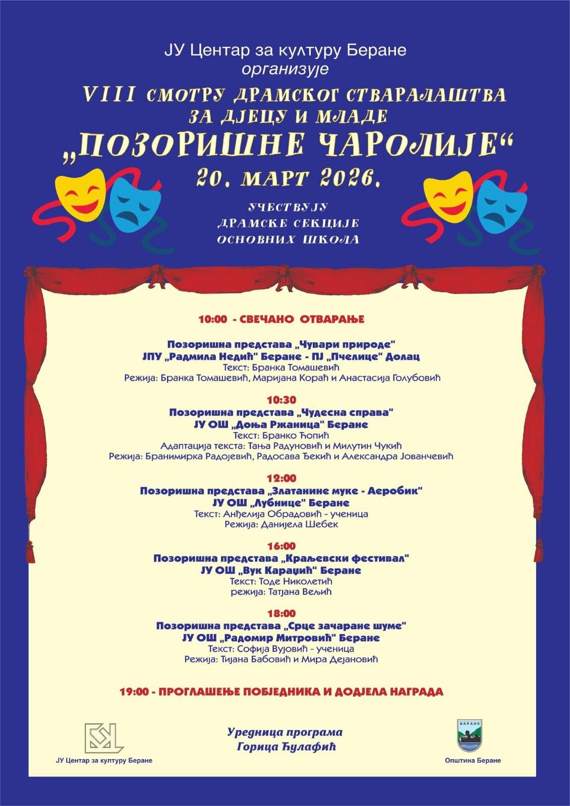 Готово 100 младих талентованих ученика основних школа из Берана и дјеце из ЈПУ „Радмила Недић“ представиће се публици у Беранама у оквиру VIII Смотре драмског аматерског стваралаштва за дјецу и младе „Позоришне чаролије“ у организацији ЈУ Центар за културу Беране, а уредница овог програма је Горица Ћулафић. На даскама које живот значе 20. марта 2026. године, када се обиљежава и Свјетски дан позоришта за дјецу, ученици у Беранама биће у прилици да виде пет позоришних остварења својих другара.