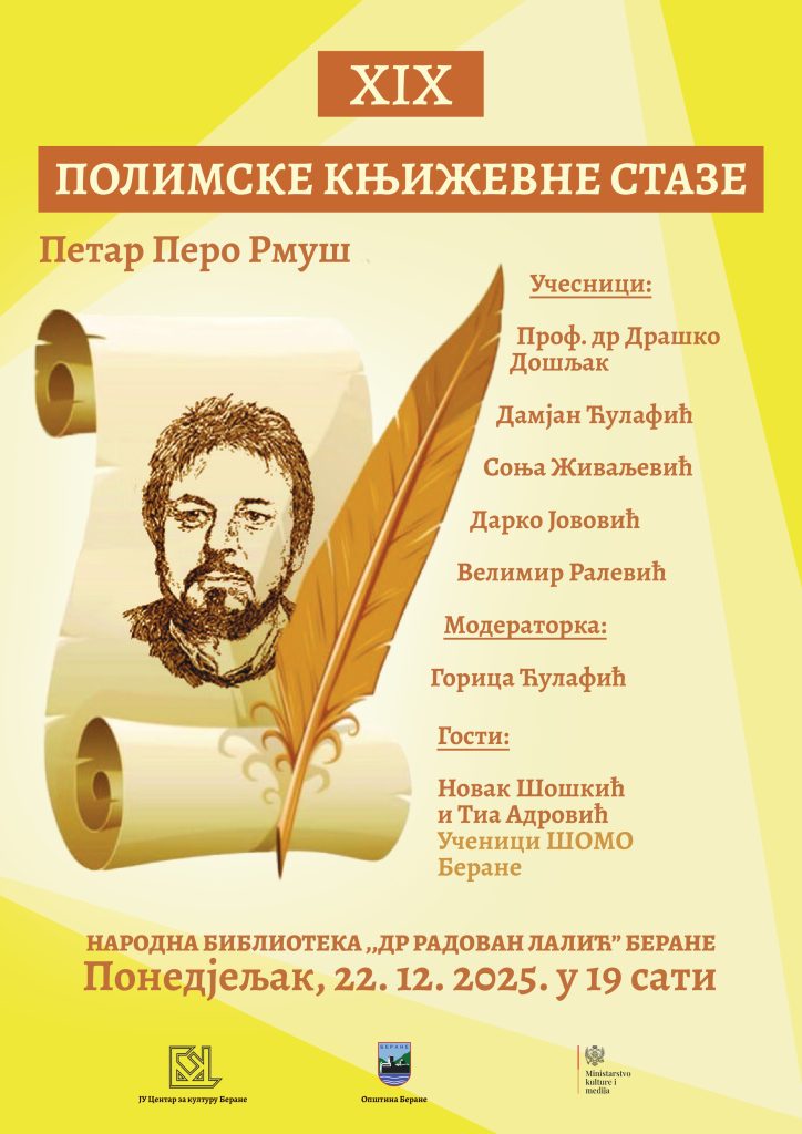 Традиционална културна манифестација XIX „Полимске књижевне стазе“ у организацији ЈУ Центар за културу Беране, биће одржана у понедељак 22. 12. 2025. године у 19:00 часова у Народној библиотеци „Др Радован Лалић“ у Беранама. Ове године „Полимске књижевне стазе“ посвећене су књижевном стваралаштву Петра Пера Рмуша.