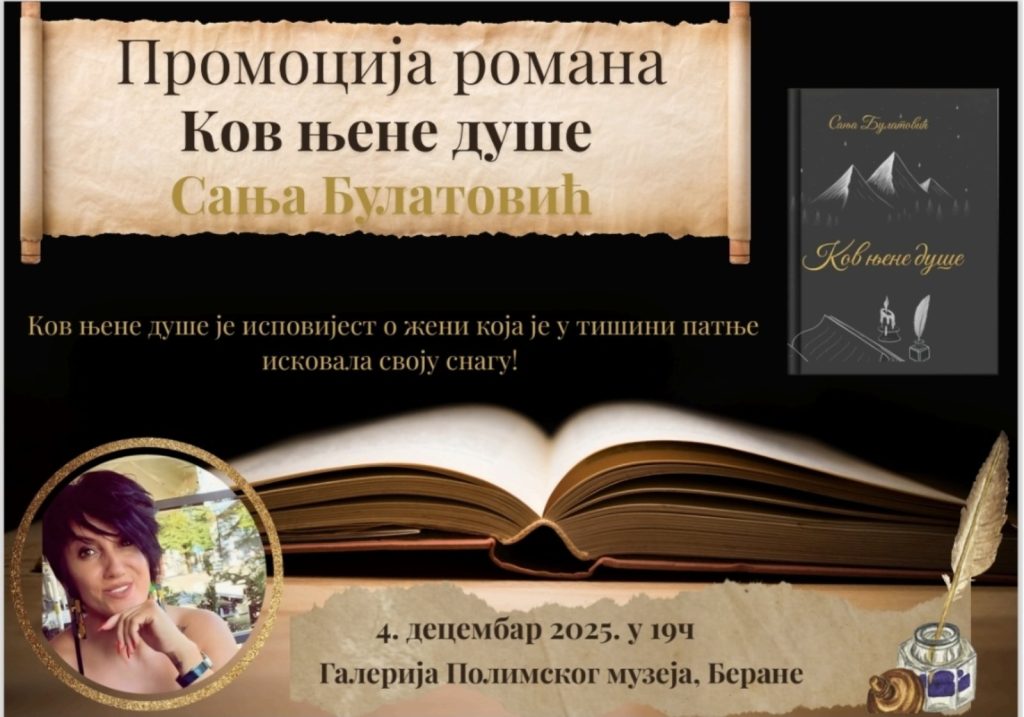 У четвртак, 4. децембра, у 19 часова, у галерији Полимског музеја у Беранама, биће одржана промоција књиге „Ков њене душе“, ауторке Сање Булатовић.