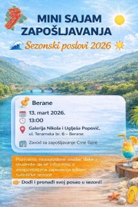 Завод за запошљавање Црне Горе организује Мини сајам запошљавања – „Сезонски послови 2026“, који ће бити одржан 13. марта 2026. године са почетком у 13 часова у Галерији „Никола и Угљеша Поповић“, у улици Терамска бр. 6 у Беранама.