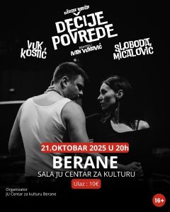 Позоришна представа „Дечије повреде“ у којој игра маестрални глумачки двојац Вук Костић и Слобода Мићаловић, биће изведена на сцени Центра за културу у Беранама у уторак, 21.10.2025. године у 20 часова. Режију потписује Иван Вуковић, по тексту Џозефа Раџива.