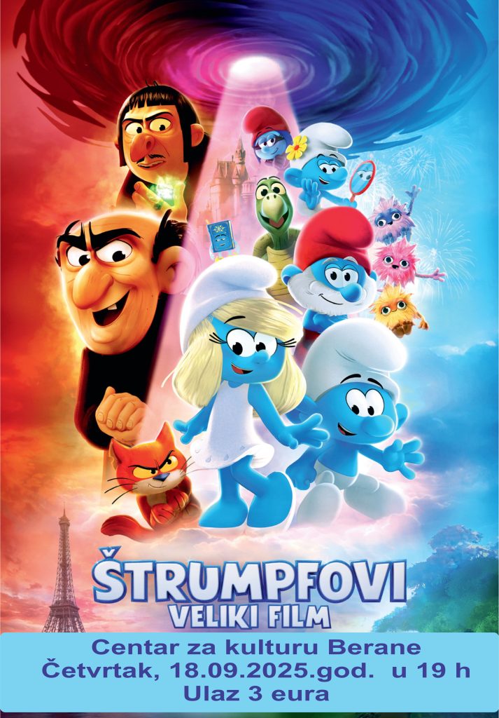 Aнимирани, синхронизовани филм „Штрумпфови: Велики филм“ биће приказан у биоскопу Центра за културу у четвртак, 18. септембра 2025. године у 19 часова.
