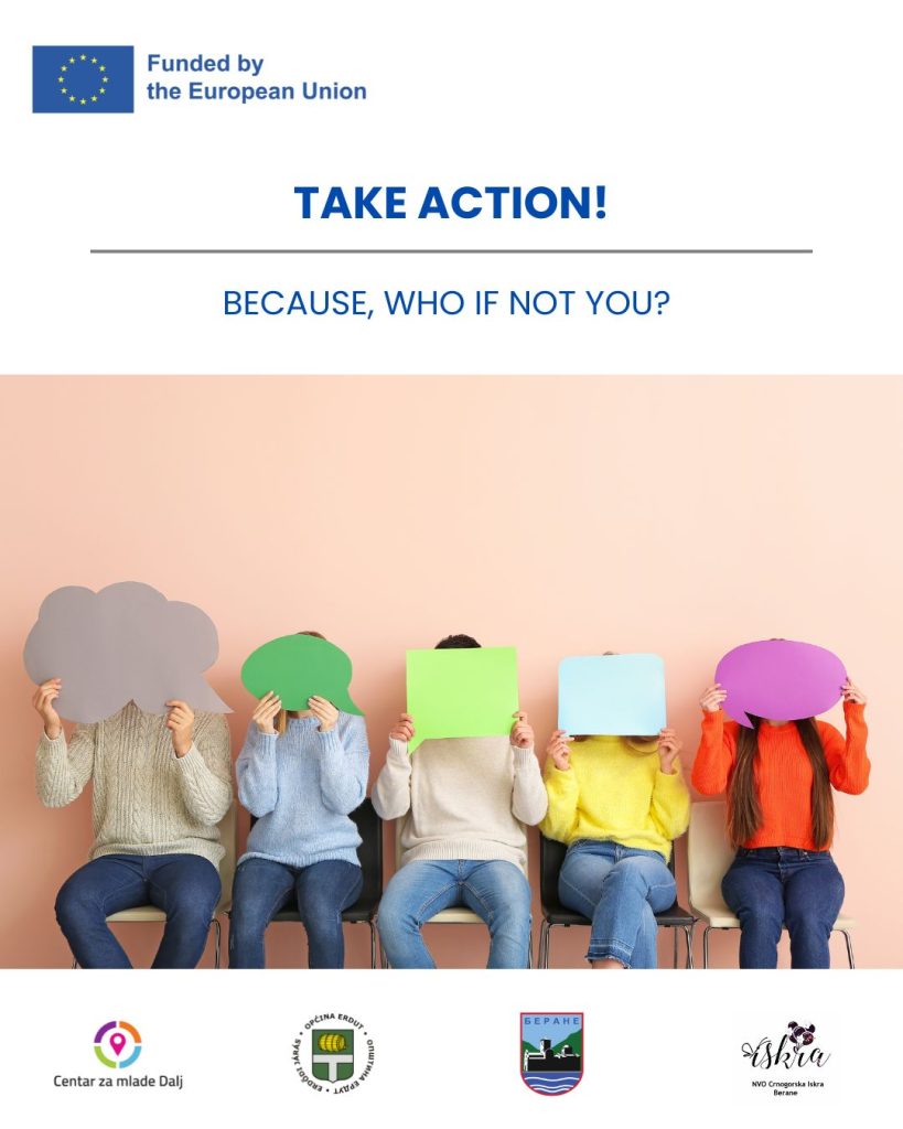 Projekt “Take action! Because, who if not you?” (Pokreni se! Jer ko, ako ne ti) pokrenut je upravo kako bi se to promijenilo. Vjerujemo da su mladi ključni nosioci promjena, da imaju pravo biti saslušani te da njihova perspektiva mora biti sastavni dio javnih politika na lokalnom, nacionalnom i evropskom nivou.