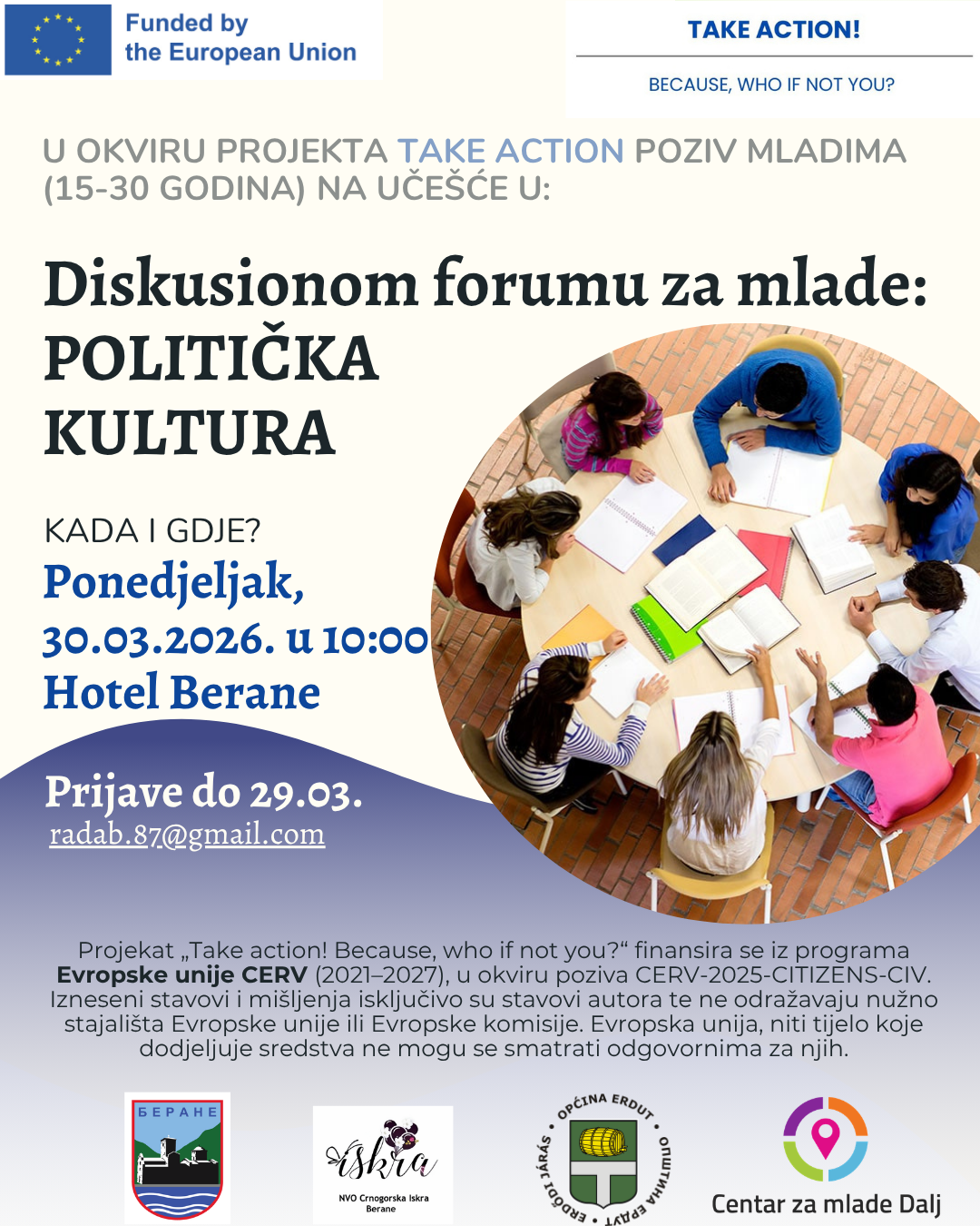У организацији Општине Беране и НВО Црногорска искра – Беране, 30. марта 2026. године у хотелу Беране одржан је Дискусиони форум за младе на тему политичке културе, са посебним фокусом на партиципативну демократију, изборне процесе и улогу младих у доношењу одлука. Радионица је реализована у оквиру међународног пројекта „Take action! Because, who if not you?“, који се спроводи кроз програм Европске уније CERV (2021–2027), а који је започео 1. јануара 2026. године. Ово је уједно друга активност која се реализује у Црној Гори у оквиру пројекта, а четврта укупно на нивоу партнерства.