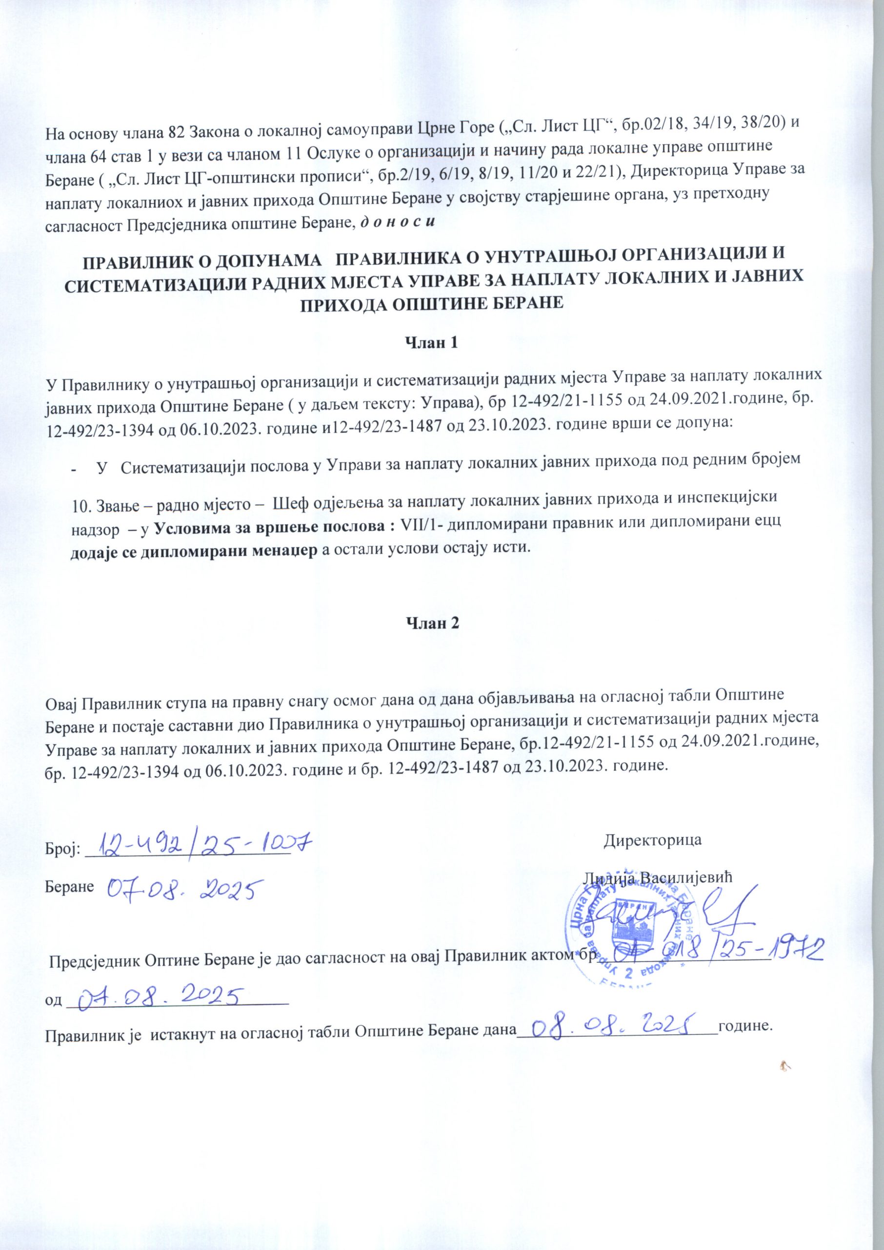 Правилник о допунама Правилника о унутрашњој организацији и систематизацији радних мјеста Управе за наплату локалних јавних прихода општине Беране